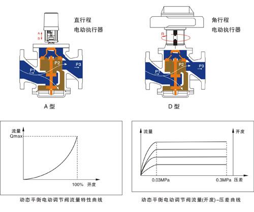 ⑵、当直行程电动执行器接受控制信号使阀轴延A—B向上下运动(或角行程电动执行器接受控制信号使阀轴延R向旋转)时,P2、P3间的开度也随之变化。由于不管系统压差(P1-P3)如何变化,P2、P3间的压差(P2-P3)始终不变,因此对应于任一开度位置,其输送的水流量都是一定的,并且电动调节阀实际的流量特性曲线与其理想的流量特性曲线是一致的,没有偏离。因此这种电动调节阀较传统的电动调节阀具有更好的调节特性。