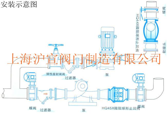 微阻球形止回阀,采用橡胶包皮球为阀瓣,在介质的作用下,可在阀体内的滑道上滚动,从而打开或关闭阀门。流量大流阻损失小,密封性能好,消声关闭,可减小水击波。水平或垂直安装均可。可用于冷水、热水、工业及生活污水等管网的水泵出口,防止介质倒流。